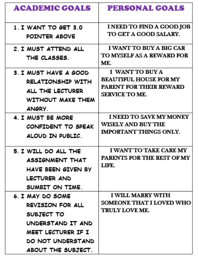 There are two term of goals which is short term goals is for academic goals and long term goals is for personal goals in life.
